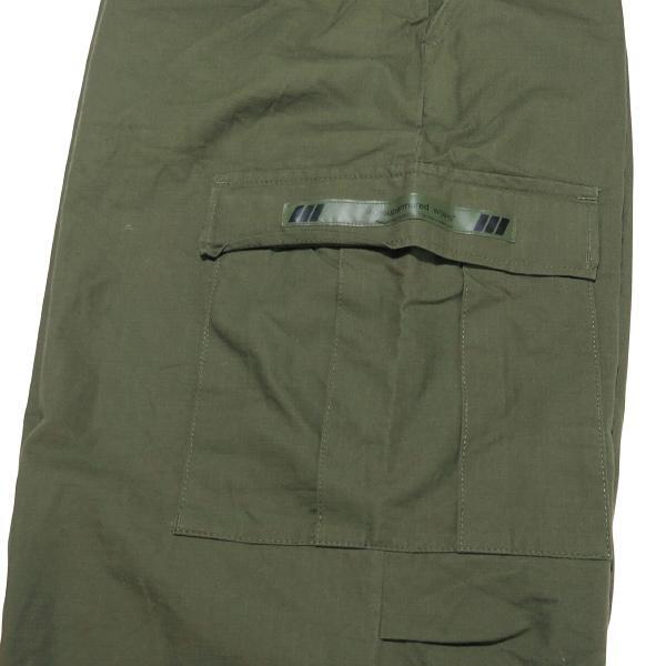 本体にコットンリップストップ生地を使用し、両脇にアコーディオン型のカーゴポケットを配置し、右ポケットにはサイズを表すロゴテープ、左のポケットのみにカモフラージュ柄の生地を使用。