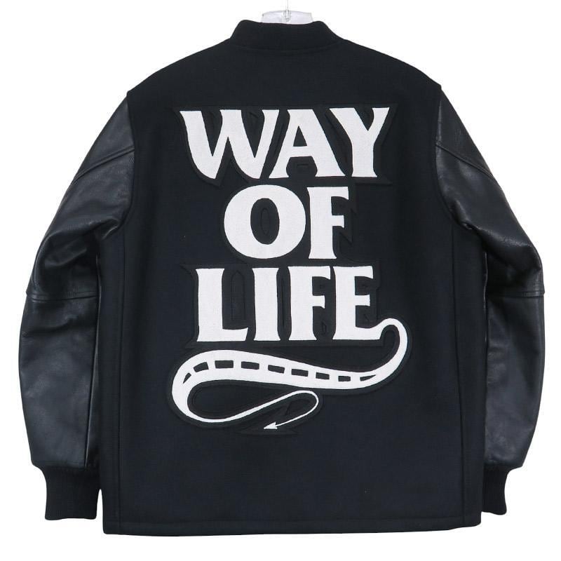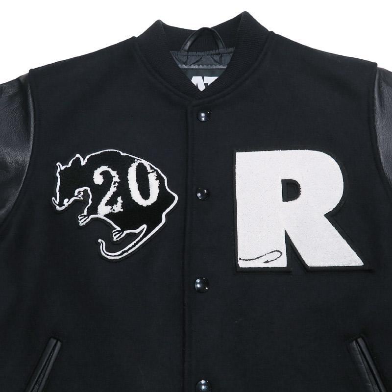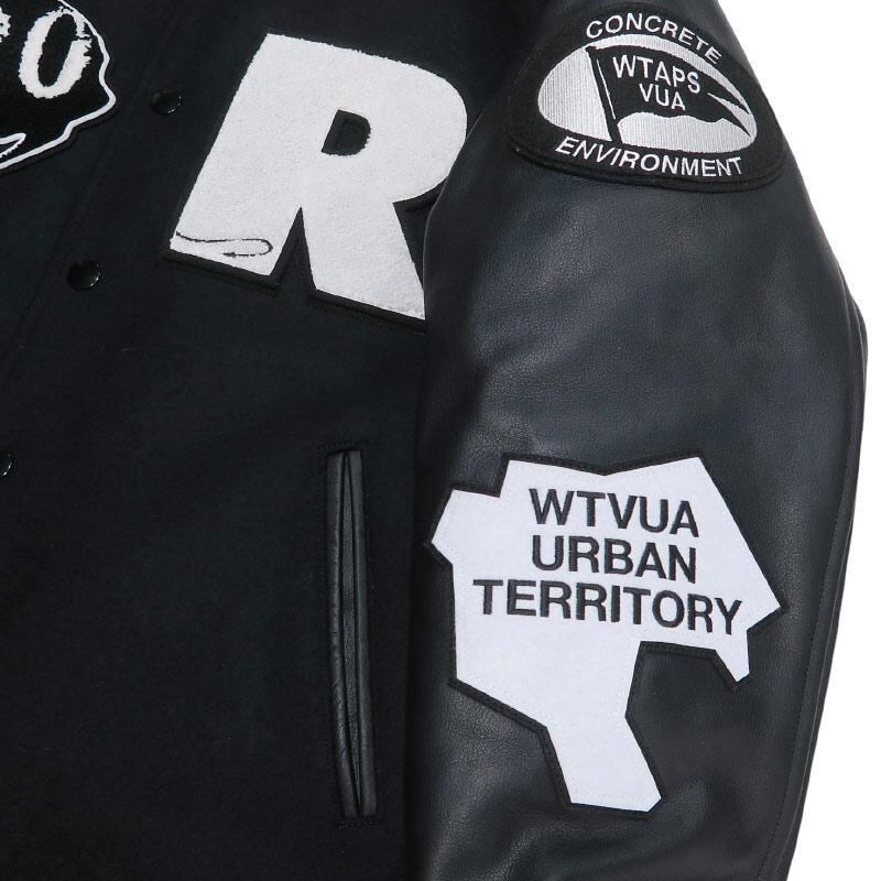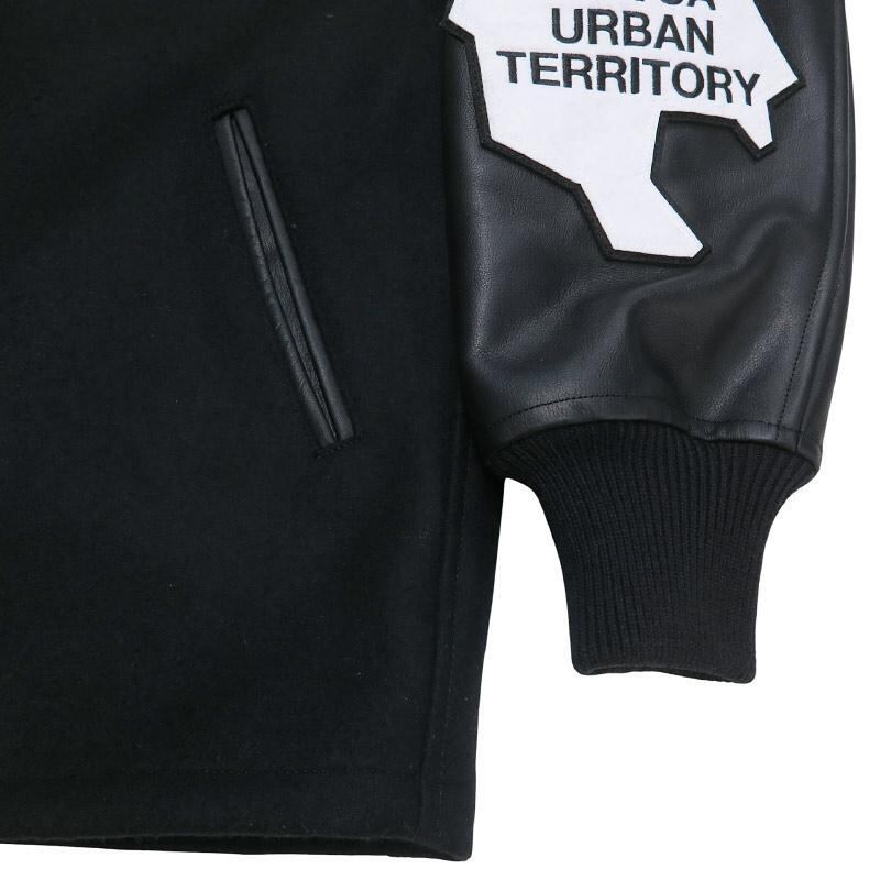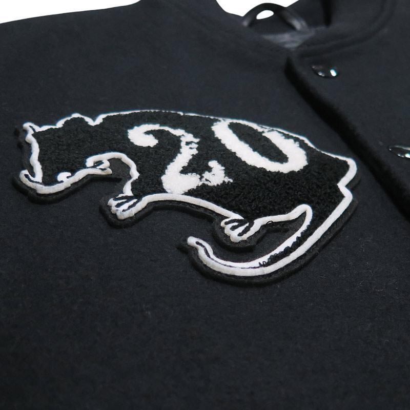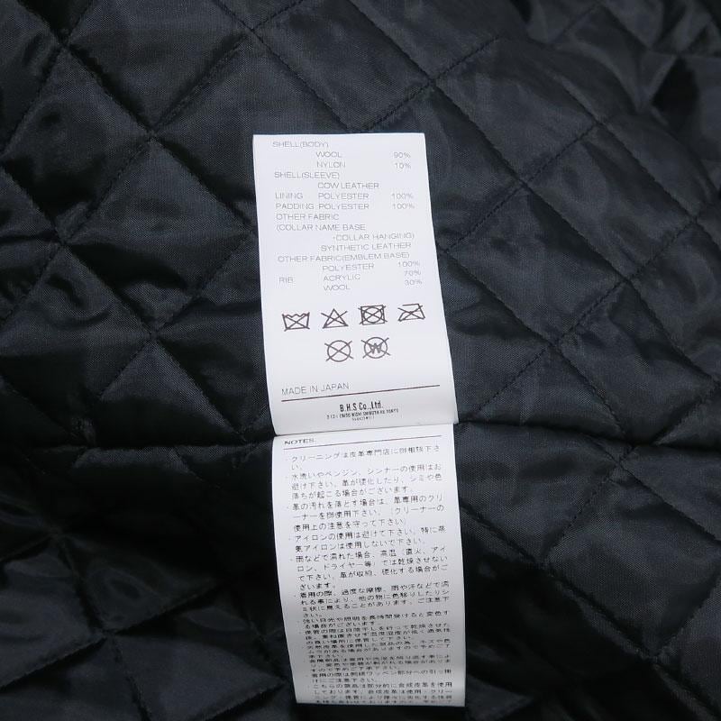 [素材] 表地(身頃):ウール 90%、ナイロン 10% 表地(袖):牛革 裏地:ポリエステル 100% 中綿:ポリエステル 100% 別布(衿ネーム土台・衿吊り):合成皮革 別布(ワッペン土台):ポリエステル 100% リブ:アクリル 70%、ウール 30%