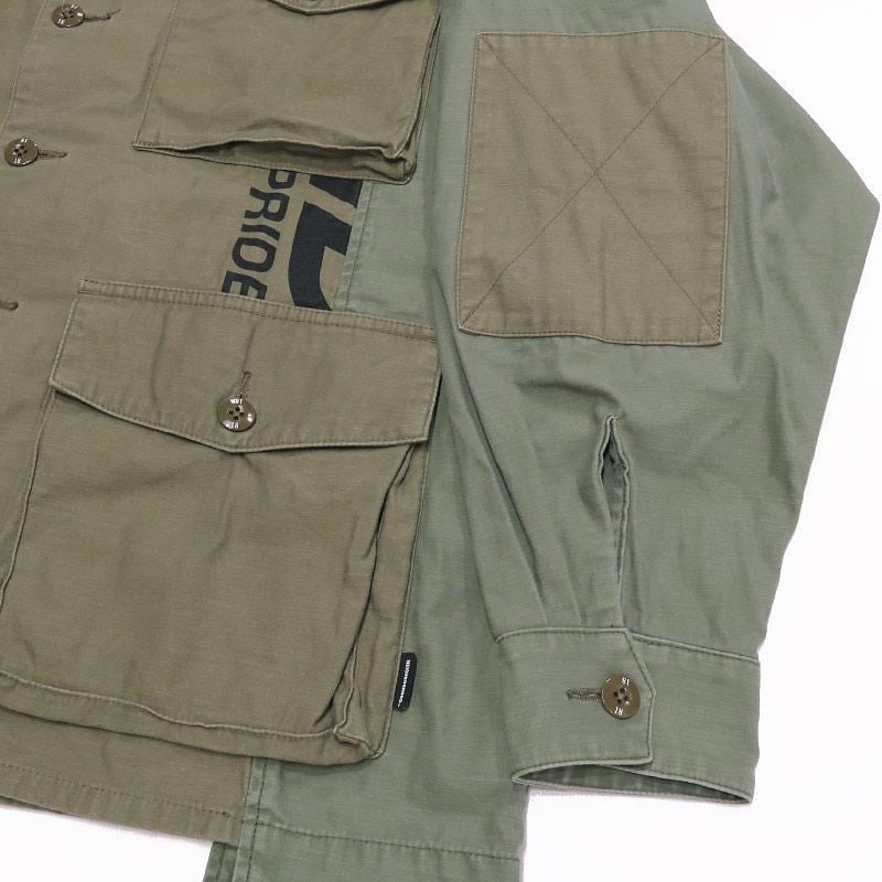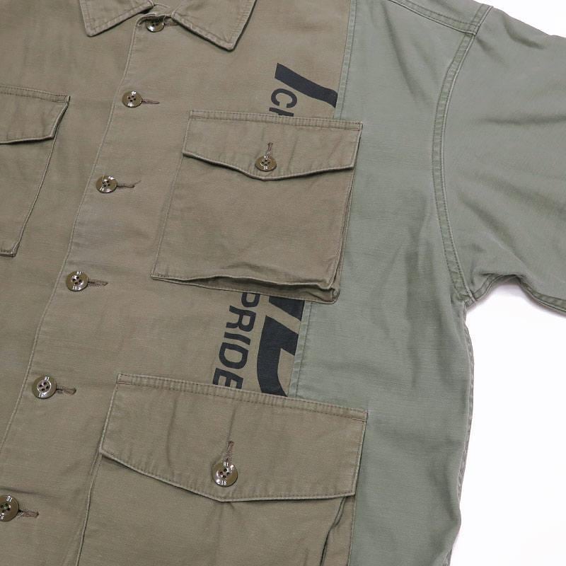 身頃と裾で切り替えを施しグラフィックの位置や裾の長さなどのバランスをあえてずらしたデザイン性に富んだミリタリーシャツになります。