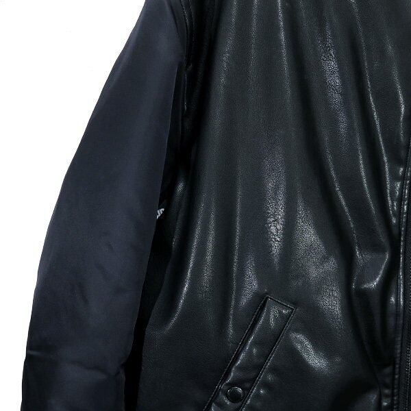 本体前身後はジップを境に左はナイロン、右は合成皮革、袖は右がナイロン、左が合成皮革、そして後身頃はウールを使用など、素材を非対称に異素材を組み合わせたデザインが特徴的。