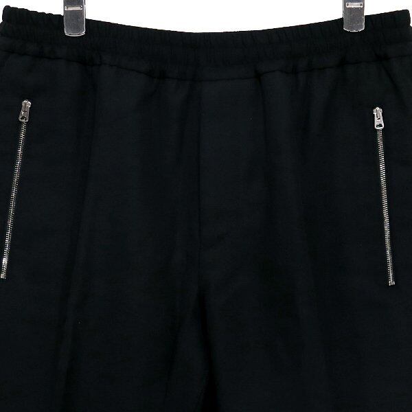 フロントは両脇にジップポケットを完備し、ヒップ、腿周りにゆとりを持たせ裾に向かってテーパードをきかせたシルエットのスラックスタイプのパンツになります。
