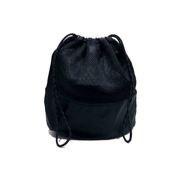 本体上部をメッシュ、下部をポリエステルツイル生地で切り替えた円柱型の巾着ポーチになります。