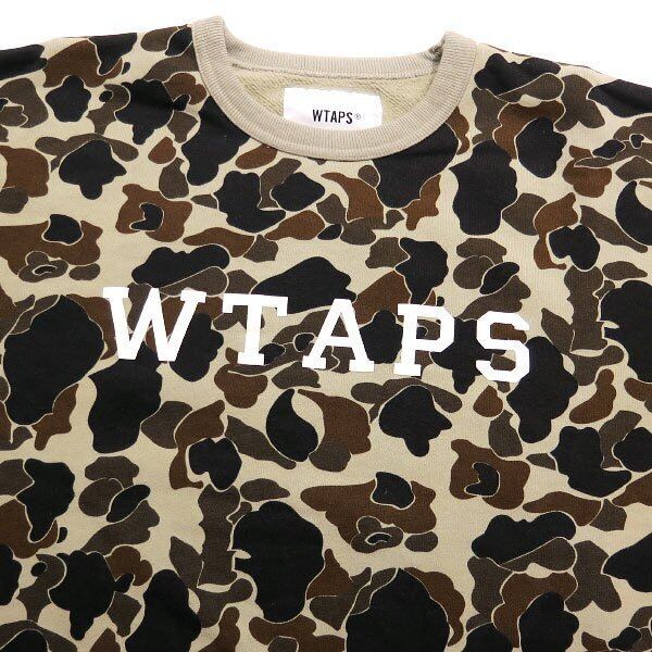 カモフラージュ柄のコットンスウェット生地をベースに胸元にカレッジスタイルのWTAPSロゴをプリントしたクルーネックスウェットになります。