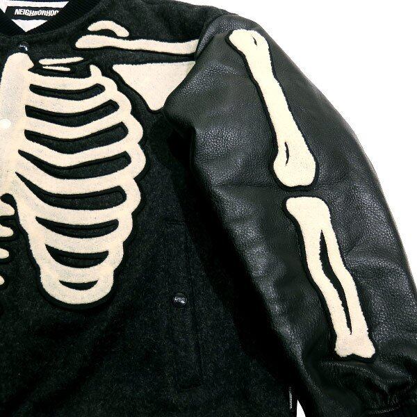 スケルトンモチーフのエンブロイダリーが目を惹くNEIGHBORHOODらしいデザインが特徴のヴァーシティジャケット。