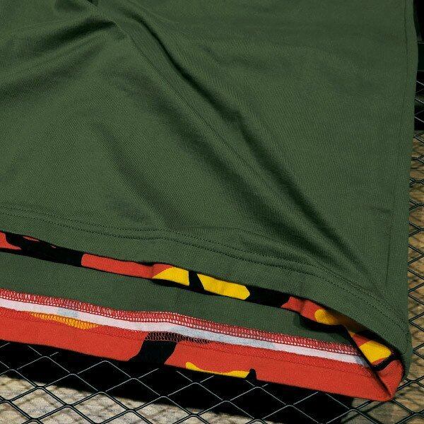 襟、袖、裾にカモフラージュ柄の生地を付けたし重ね着風のレイヤードギミックを再現したTシャツになります。