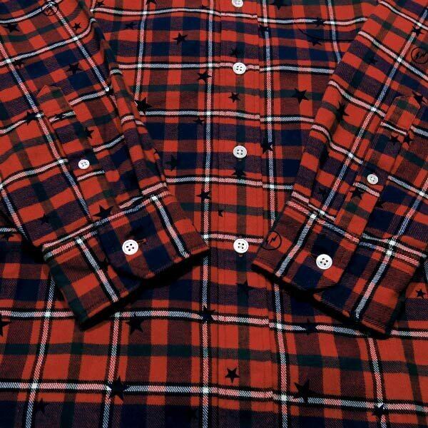 本体に少し起毛感のある薄手のコットンフランネル生地を使用し、トラディショナルなチェックパターンにスタートとサークルサンダーをちりばめたゆったりとしたシルエットのボタンダウンシャツ。