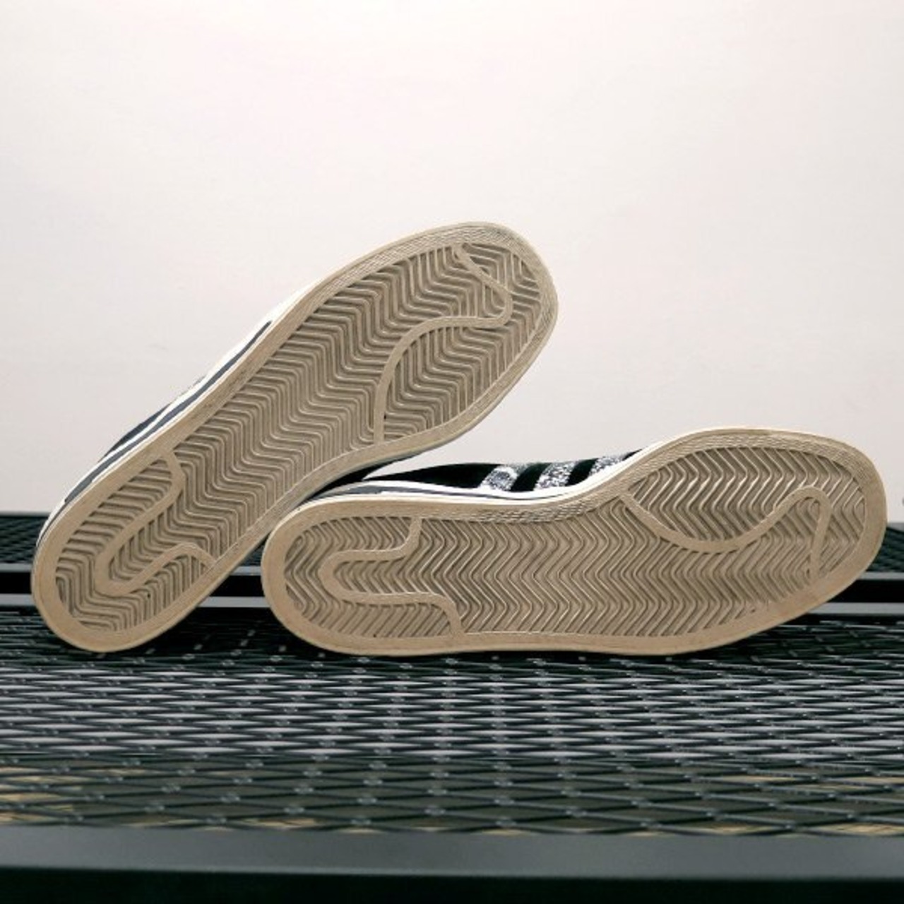 adidasの名作コートシューズ CAMPUS をベースに、アッパーはブラックスエードを採用し、ミッドソールにライトニングボルトをレイアウト。