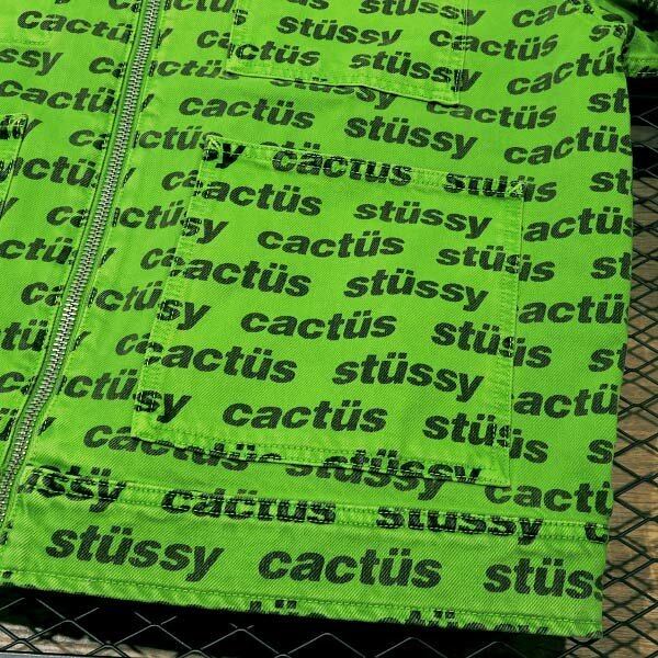 本体に全体にstussyとcactusのテキストを落とし込んだ発色の良いカラーデニムのような厚手の生地を使用し、左胸と腹部両脇にアウトポケットを配置し、バック裾にレザーパッチとボタンアジャスターを備えた、フロントジップ開閉のワークジャケットになります。