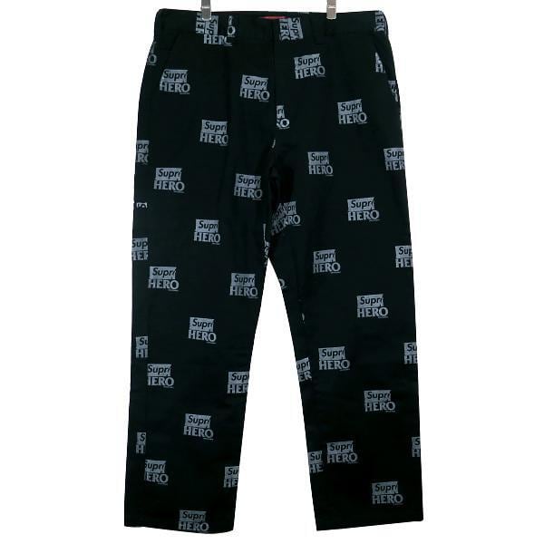 SUPREME定番のワークパンツをベースに全体に両ブランドのロゴを組み合わせたSuprHERO(スーパーヒーロー)ロゴをプリントしたコラボならではの一本です。
