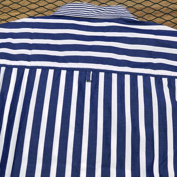 本体に薄手のコットン生地を使用し、身頃と襟でピッチの違うストライプ柄を採用し、左胸にボタン付きポケットを配置したクラシカルなシャツになります。