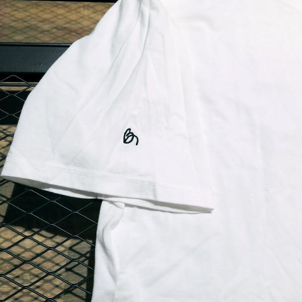 フロント裾右にスペックタグ、両袖に刺繍モチーフ、左袖先にピスネームタグが付いたBULLINKボディのTシャツです。