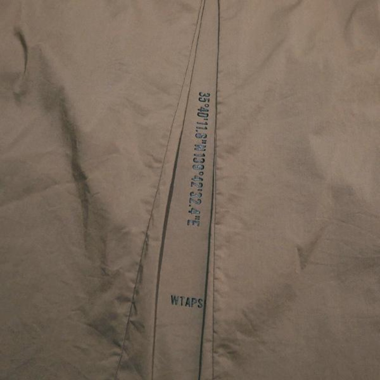 バックヨーク中央にプリーツを施し、広がりのあるゆったりとしたシルエットを表現し、プリーツの内側にGPSロゴとWTAPSロゴのプリントが施されています。